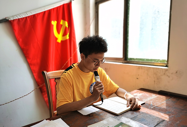 志愿者在村广播站宣传防疫防洪知识