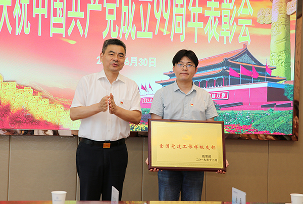 校党委书记朱爱胜同志代表学校党委向受表彰的先进集体和个人表示祝贺,并向全校广大共产党员致以节日的问候。在简要回顾了中国共产党99年光辉历程之后,朱书记指出,2020年是我国决胜全面小康、决战脱贫攻坚,实现“十三五”规划的收官之年;是实现“两个一百年”奋斗目标的历史交汇之年;是在党的领导下全民抗疫之年。也是学校推进国家“双高校”建设的开局之年,是学校事业蓬勃发展的关键之年,在疫情防控常态化新形势下做好今年的工作、实现年初制定的目标任务,需要全校上下凝心聚力、砥砺奋进,全校各级党组织和广大党员要进一步增强“四个意识”,坚定“四个自信”,切实做到“两个维护”,坚持人民至上,努力开创学校党建和各项事业发展新局面。