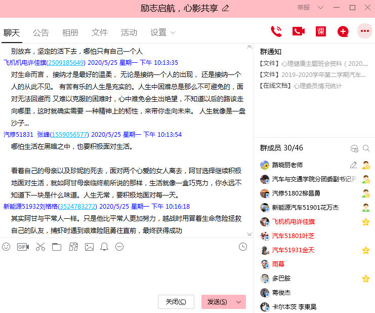 “5.25”是全国大学生心理健康日。5月25日,汽车与交通学院顺利开展心理健康月系列活动之“励志起航,心影共鸣”线上观影主题教育活动。本次活动由汽车与交通学院关工委、学生办共同发起,心理委员及部分感兴趣的同学参与。