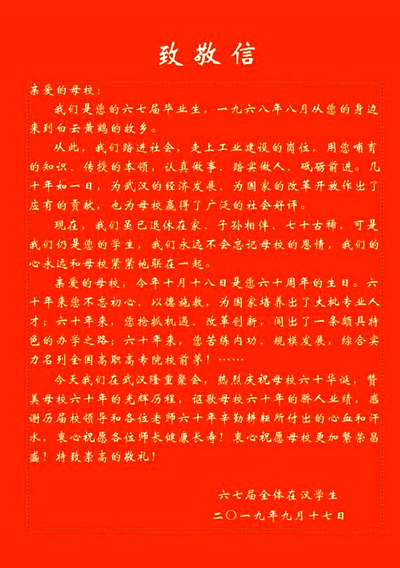 活动现场气氛热烈,30余位年过七旬老校友高唱《农机校校歌》和《共创辉煌-乐鱼app登录入口之歌》,齐声朗诵献给母校的《致敬信》,深切的感谢母校的栽培。大家畅叙校友之谊和对母校的思念之情,无不为母校60年来取得的成就感到骄傲,衷心祝愿母校的明天更美好。