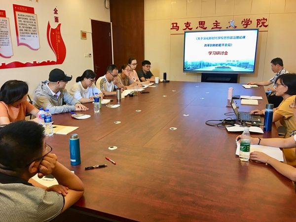 接着,在周春兰院长的主持下,部门召开专题学习研讨会,深入学习中共中央办公厅、国务院办公厅印发的《关于深化新时代学校思想政治理论课改革创新的若干意见》(以下简称《意见》)。周春兰在带领大家学习《意见》全文的基础上,提出马院思政课改革创新要做到“三结合两改进四有”,即:思政课教学要与最新成果相结合、与学生专业相结合、与地方文化相结合;改进教学手段、建好用好在线课程,改进教学方法、坚持问题导向释疑解惑;坚持四有目标要求:思政课堂要有设计、有效率、有特点、有收获。马院全体教师在学习交流中纷纷表示,思政课教师必须认真领会《意见》精神,在《意见》指导下,发扬改革创新精神,打造思政金课堂,承担好铸魂育人的时代责任。