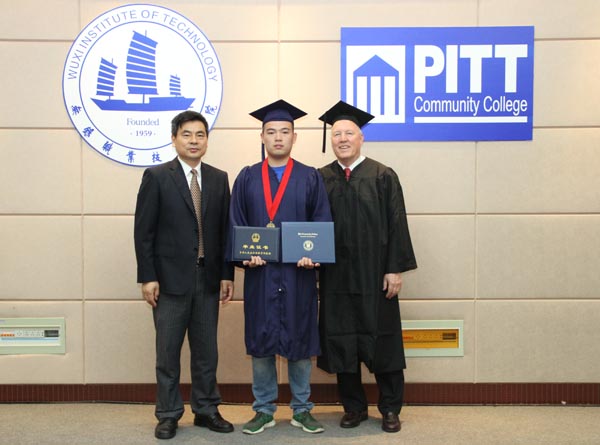 毕业典礼由机械学院总支书记吴慧媛主持,朱爱胜书记和马西院长分别致辞,对毕业班的学生们表达了祝福与期望,华坚副校长宣布了毕业情况和毕业生名单。经过中美双方三年的共同培养,机制11181班40名同学全部获得乐鱼app登录入口毕业证书和皮特社区学院专业证书,朱爱胜书记和马西院长共同为毕业生颁发了证书。毕业生代表于广超同学用英语发表了精彩的毕业感言,优秀毕业生代表还向双方学校赠送了他们自制的作品。(机械)