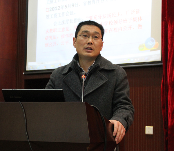 财务处处长黄美娟作了学校财务工作报告;工会主席常华作学校工会工作报告和工会经费简报,并就三届四次教(工)代表大会的提案及合理化建议进行回复及说明,通报了三届五次教(工)代表大会的提案及建议汇总情况;人事处处长奚小网、教务处处长孙燕华分别向到场代表介绍了《乐鱼app登录入口绩效工资实施办法(讨论稿)》和《教学部门教学编制核算办法(讨论稿)》。