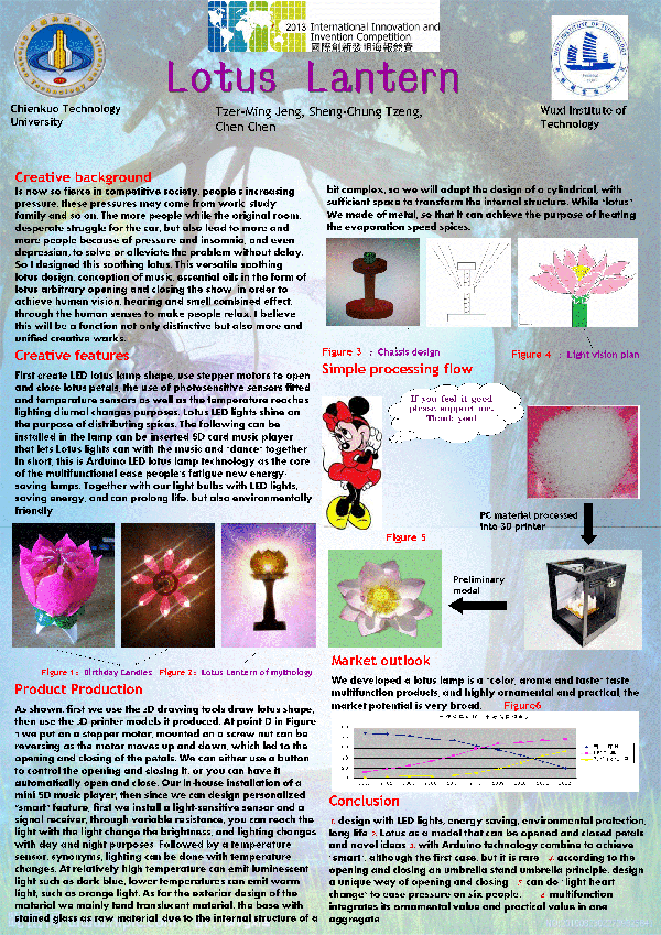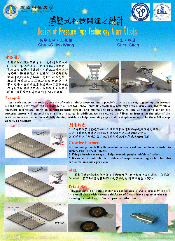 颁奖典礼由台湾国际发明得奖协会和中华创新发明学会共同主办。陈晨同学设计的“感压式科技闹钟”及“宝莲灯”两款海报以独特的审美设计理念和充实新颖的内容,受到专家评委的好评,双双获奖。