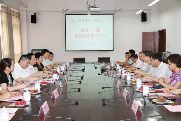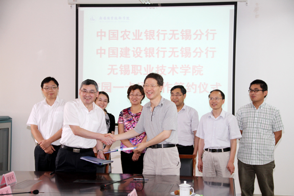 6月20日下午,我校与中国建设银行、中国农业银行关于“校园一卡通”项目的银校合作三方签约仪式在国际交流中心205会议室举行。校领导戴勇、冯渊及相关职能部门负责人,中国农业银行无锡分行副行长周学军一行,中国建设银行无锡分行副行长沈卫兴一行出席了签约仪式。