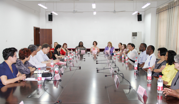 5月29日下午,校领导戴勇、华坚、曹建林及国际教育学院、团委等相关部门负责人在国际交流中心二楼会议室接待了合唱团成员,戴勇校长回顾了两校文化交流的渊源,充分肯定了美国社区学院国际发展联盟的国际交流平台作用,并预祝两校此次文化交流活动圆满成功。曹建林副校长向合唱团成员介绍了我校发展概况。当晚,CLC代表团美籍华人于丽华博士为我校学生开设了题为《美国人的婚姻与家庭》的讲座,详细介绍美国家庭的历史演变。