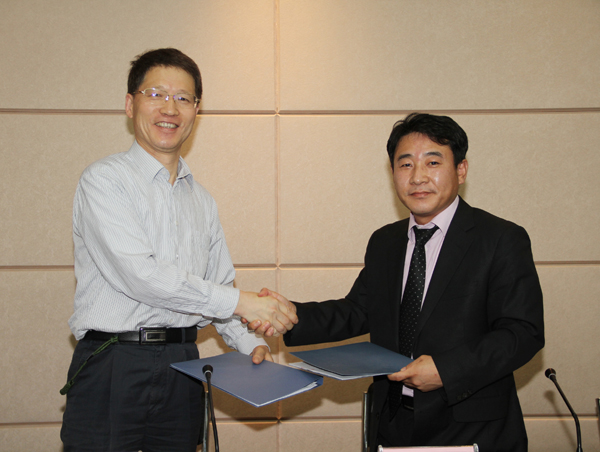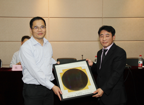 签约仪式由物联网技术学院党总支书记郭再泉主持,曹建林副校长回顾了双方合作共建冠名班的相关情况,SK海力士公司人事部尹国汉部长期望冠名班学生努力学习,日后能够加入海力士实习、工作。随后,戴勇校长与尹国汉部长代表双方签订协议。SK海力士公司还向我校赠送了运用最新20nm技术制造的12吋晶圆片,供教学使用。