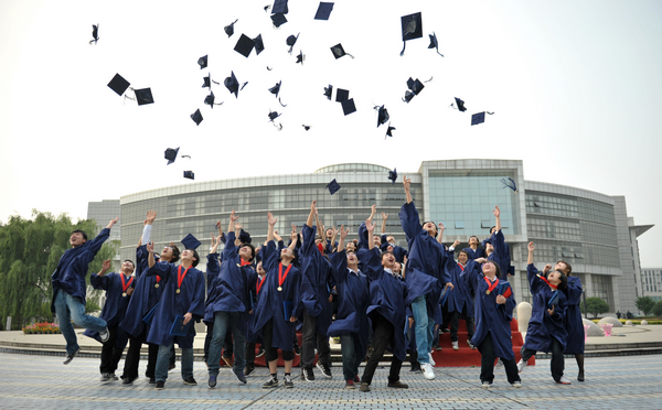 同学们兴奋地抛起学位帽