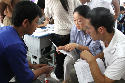 新生班班主任在向新疆籍学生讲解报到手续办理