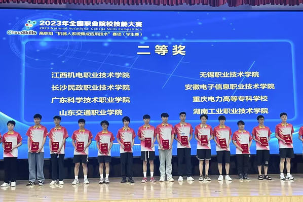机器人系统集成赛项对接工业机器人系统集成新技术发展需求,针对高等职业院校自动化类专业人才培养目标,融入 PLC 控制技术、虚拟调试技术、机器视觉技术、工业网络技术、工业机器人现场编程和离线编程技术、MES 技术、人工智能技术等工业机器人系统集成技术。我校参赛队由指导老师机械技术学院唐霞、魏昌洲和学生谭青芳、杨林标组成,首次参加该赛项国赛即荣获二等奖的好成绩。