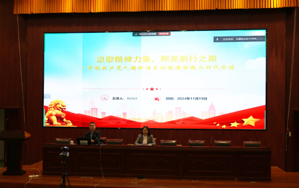为深入贯彻落实习近平总书记在中共中央政治局第五次集体学习时的重要讲话精神,深入实施时代新人铸魂工程,引导广大师生党员认真学习贯彻《党史学习教育工作条例》,推动党史学习教育常态化长效化,11月19日下午,学校举办中国共产党人的精神谱系专题报告。无锡商业职业技术学院副院长周丙洋受邀以“汲取精神力量 照亮前行之路——中国共产党人精神谱系的根源脉络与时代价值”为题作专题报告。学校党委副书记杨雪琴主持,全校近400名师生党员代表齐聚国际交流中心一楼报告厅聆听报告,17个党总支设立分会场,500余名党员在线观看学习。