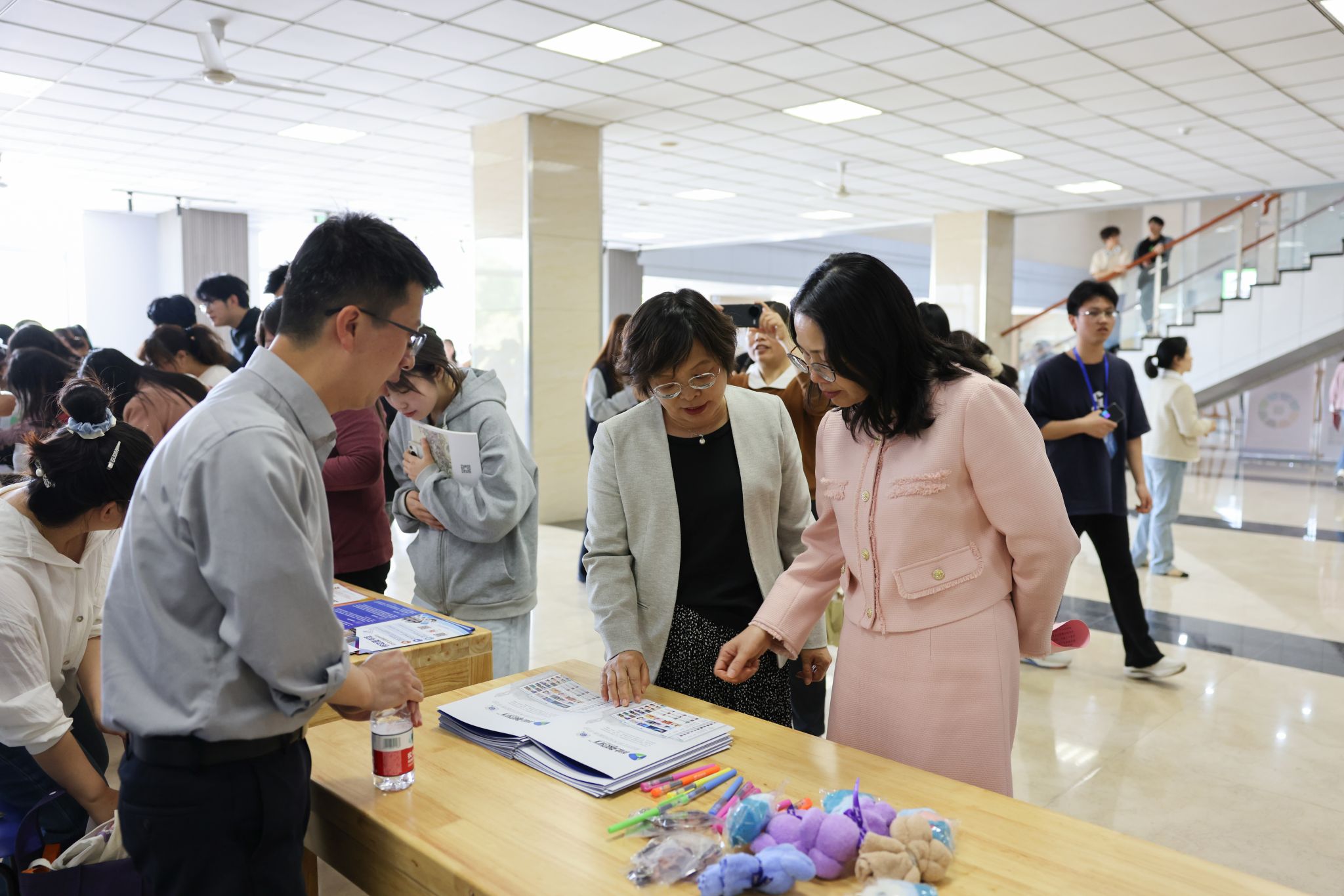 “书馆游园会”社团展示体验活动在一楼大厅和二楼中庭热闹开展,现场人头攒动,气氛热烈。书法艺术、棋类游戏、非遗卡纸彩色刮画、影谜猜猜乐等社团展示活动吸引了众多读者的参与。在图书馆惜花园,校团委举办的“书香蠡溪 阅享未来”青春荐读会,为青春学子提供了一个分享心得、交流感悟的平台。
