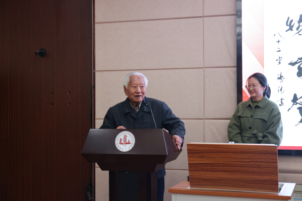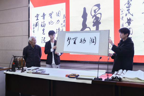 活动中,陆老先生现场挥毫,为同学们书写“润物无声”,勉励大家认真学习,踏实做事,并为同学带来专题讲座《学好书法的深远意义》,分享自己学习书法的经历和体悟。蠡溪书法协会李圣杰同学作为代表感谢了陆老先生多年来的悉心指导,并承诺将牢记嘱托,永葆初心,勤恳练习。