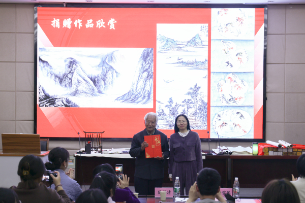 陆老师现已有85岁高龄,在他封笔前毅然决定将手中的书画作品共计十八件,悉数捐赠给我校。杨雪琴为陆老师颁发了捐赠证书,对他的无私大爱表示诚挚谢意,并对学校团委和广大师生提出希望,一是要以美育人,深刻认识高校美育的重要地位和育人价值;二是要以美化人,全面提高学生的审美和人文素养;三是要向美而行,将美的体验和美的教育扎根生活,融于日常。