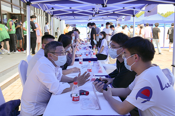 现场,载着企业HR的“面试大巴”开进学校,大巴车一面开拓成面试窗口,车窗上印有企业信息。招聘人员采取全程不下车、通过语音对话系统“隔窗面试”的方式开展线下招聘。学生浏览企业岗位介绍并扫码报名面试,将简历送至现场工作人员处,简历由工作人员统一送至面试大巴。学生领取面试号后在等待区域等候面试,现场搭建起1米高面试台,让企业HR与学生交流时处于同一高度,做到了面对面,但不接触。现场还搭建了简历投递站、简历打印站、就业指导站、医疗服务站、征兵咨询站和党员志愿服务站,学工党员教师为毕业生职业生涯适应、简历优化、职业决策等生涯和求职困惑开展一对一辅导,提供就业政策解读和指导,为毕业生提供现场周到服务。