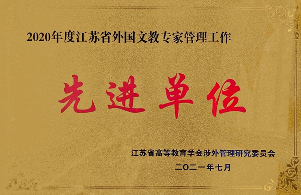 7月19日,江苏省高等教育学会涉外管理研究会(原外国文教专家工作研究会)年会由江苏大学承办在镇江举行。江苏省教育厅国际合作与交流处处长贺兴初、江苏省外国专家局局长杨小平、江苏省高等教育学会秘书长吴立保出席会议并讲话,省内67所高校代表参加了此次会议。年会表彰了全省在外国专家管理方面有突出贡献的高校,我校荣膺“2020年度江苏省外国文教专家管理工作先进单位”。这是我校连续四次获此殊荣,充分彰显了学校的涉外管理的高水平和硬核实力。