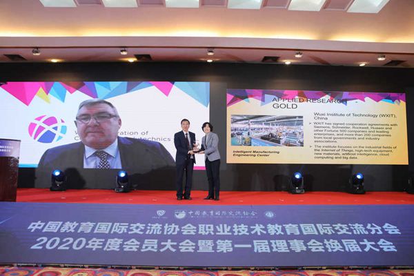 校领导龚方红出席颁奖典礼并代表我校领奖,从WFCP副主席、交流协会副秘书长沈雪松接过了奖杯,并发表获奖感言。随后龚方红校长作了题为《打造智能制造技术创新服务平台服务区域中小企业智能化转型升级》的经验分享,从学校发展现状、技术积累、社会培训情况、校企合作目标介绍了我校在职业教育技术“应用研究与创新”领域的经验和做法,着重展示了新形势下学校加强技术应用研究和教育服务国际化的最近成果,以及学校的国际化的展望,受到全场与会人员的热烈掌声。随后,龚方红校长接受江苏国际频道,江苏教育频道采访。