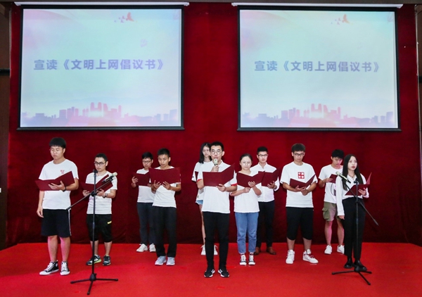 与会领导向首批获聘共筑网络“同心圆”网络安全知识公益讲座宣讲员颁发聘书。我校学生代表登台宣读《文明上网倡议书》,号召同学们依法上网,严格自律,文明上网,弘扬新风尚,理性上网,传播正能量,做清朗网络空间的主力军和践行青春责任的合格网民。