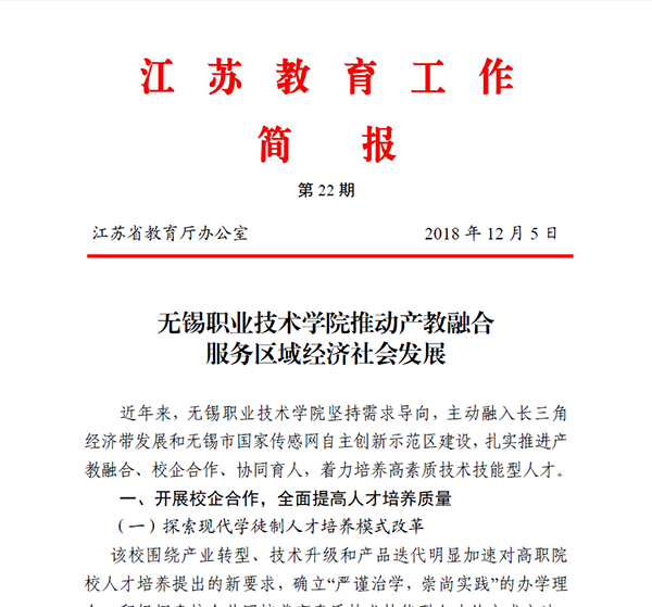 12月 5日,《江苏教育工作简报》2018年第22期以《乐鱼app登录入口推动产教融合服务区域经济社会发展》为题,专题报道了我校近年来通过产教融合提高人才培养质量、提升服务支撑产业能力和打造高水平师资队伍等方面采取的做法和取得的成效。