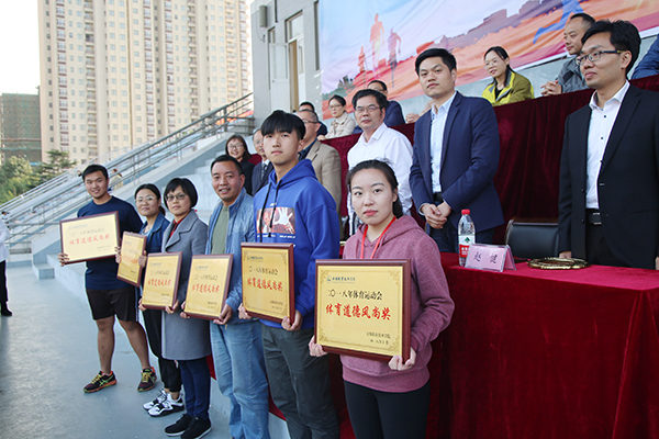 闭幕式由体育部直属党支部书记吴斌主持。校工会主席沈明南宣布了体育道德风尚奖和广播操比赛名次;总裁判长冯伟宣布了男、女团体总分前六名,与会领导向获奖集体和个人颁发了奖牌和证书。