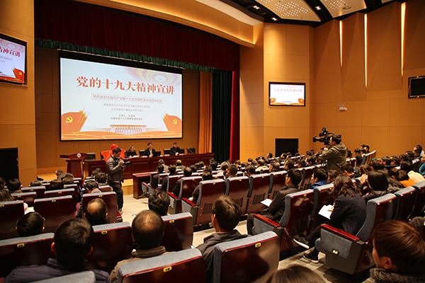 校党委副书记谈向群主持宣讲会。为了更好学习领会党的十九大精神,深入推进习近平新时代中国特色社会主义思想研究,牢牢把握学校发展正确方向,学校成立了习近平新时代中国特色社会主义思想研究会。宣讲会之前,吴春林局长和我校党委朱爱胜书记共同为研究会揭牌。