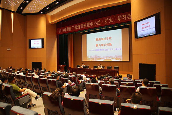 新学期开学在即,8月29日至30日,学校在综合楼一楼报告厅举办暑期干部培训班暨中心组(扩大)学习会,全体校领导、中层干部通过专题报告、分组讨论、主题交流等形式开展学习、研讨,聚焦卓越学校,聚力学习创新。