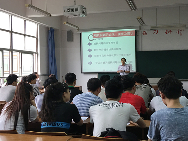 上课铃声还没响起,龚方红校长就快步走进了教室,与同学们亲切地打招呼,并问大家:“有多少人对国际形势感兴趣?”、“同学们印象中的朝鲜是什么样子?”随后自然地引入授课主题“朝核问题的由来、实质及现状”,开始了一堂别开生面的“形势与政策”课。