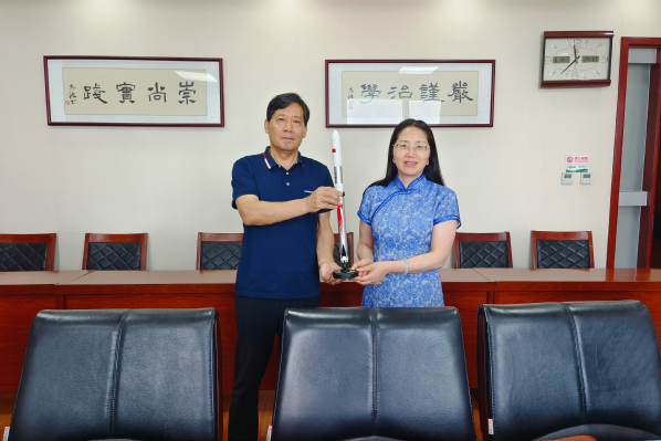 随后,智能制造中心总经理杜方平向学校捐赠朱雀三号运载火箭模型一枚,杨雪琴代表学校接受捐赠。
