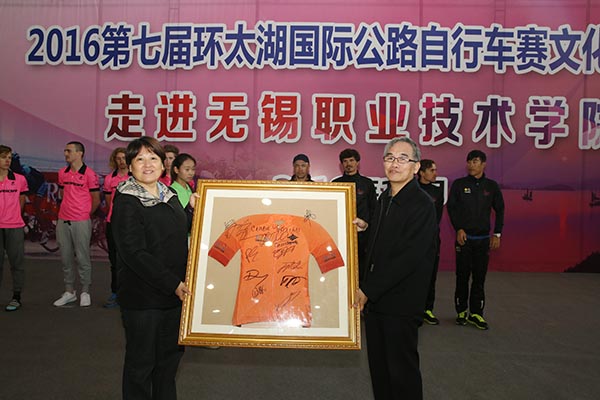 11月4日上午,由国家体育总局自行车击剑运动管理中心、江苏省体育局、浙江省体育局和无锡市、苏州市等人民政府联合主办的2016第七届环太湖国际公路自行车赛的文化推广校园行活动在我校体育馆举行,华坚副校长及300余名师生和国内外自行车专业运动员参加了本次活动。