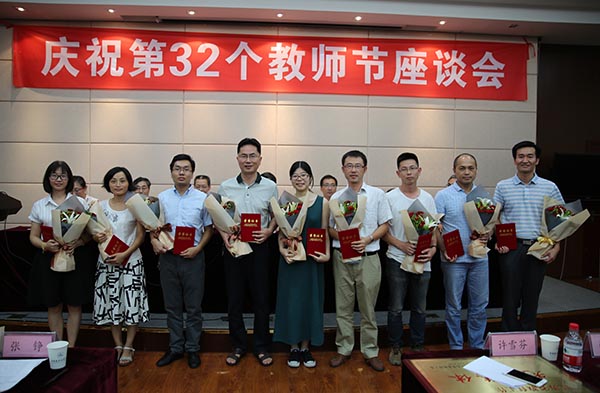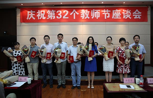 99日下午,在第32个教师节来临之前,我校在国际交流中心二楼报告厅召开座谈会,庆祝教职工自己的节日,表彰先进集体和优秀个人。校领导朱爱胜、龚方红、谈向群、华坚、冯渊、顾京、周桂瑾,受表彰人员、教职工代表和学生代表等近百人参加了座谈会。