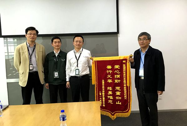 华坚副校长介绍了学校的办学情况,愿与公司建立良好的校企合作关系,通过工学结合、顶岗实习、订单培养等形式共同推进我校毕业生的高质量就业。华坚校长还对该公司日前为突发疾病的2016届实习生董胜给予的援助表示感谢,并向公司赠送了锦旗。华坚副校长指出,正是因为公司及时有效的处置,使得董胜能在第一时间得到救治并获康复,体现了企业以人为本的理念。