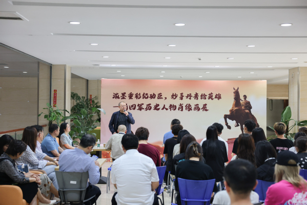 汤沐向到场师生介绍了画展作品的创作过程和艺术手法,带领大家进一步回顾了新四军的光辉历程,了解了新四军的动人故事。画展中的肖像作品均为烙画,人物形象栩栩如生、质感沉浮厚重,展现了扎实的专业功底和艺术观赏价值,具备强烈的艺术感染力。