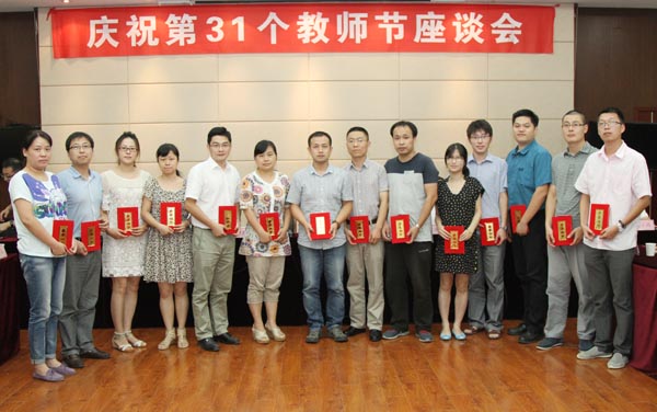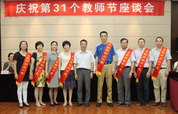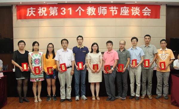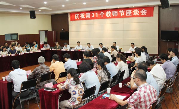 9月8日下午,我校召开庆祝第31个教师节座谈会。校领导龚方红、谈向群、顾京、冯渊、华坚、周桂瑾,组织部、人事处、工会等相关部门和院(部)负责人,教授博士代表、获表彰的优秀教师及优秀教育工作者、学生代表70余人参加了座谈。