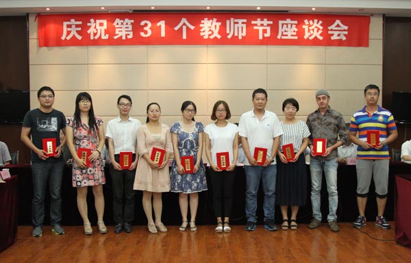 随后,校领导为获表彰教师颁发了荣誉证书;龚方红校长为辛勤从教三十年的教师佩戴绶带。郭琼、俞张勇、外教Dave三位教师代表,结合自身工作和生活实际,畅谈了对学校跨越式发展的所见、所闻、所感,表达了身为教师的自豪感与责任感,回顾了在教育、教学工作中的体会和感悟,针对学校的学科专业建设、科研激励政策、优化师资队伍建设、建章立制规范教学管理等方面提出了宝贵的意见和建议,学生代表苑威信同学也向全体教师表达了感谢和节日的祝福。
