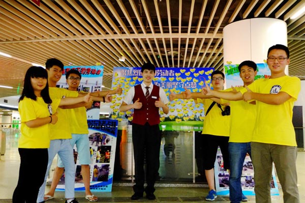 7月16日,志愿者们走进地铁1号线,向往来市民展示这些天来他们采集的美丽画面。画面中有工地上扛着重物的建筑工人,有马路上清扫杂物的环卫人员,有小区里执勤的保安,也有十字路口指挥交通的交警,不同的职业和面孔,相同的却是高温烈日下他们灿烂的笑容和美丽的坚守,正是他们让这个城市日新月异。为了让更多的人关注到他们,感恩他们的辛勤付出,志愿者们将这些天拍摄到的画面做成展板,并呼吁广大市民为这些劳动者点赞。展板上生动的画面,志愿者们诚挚的笑容,让很多往来的路人停下了匆匆的脚步。他们仔细浏览展板上的图片和文字,耐心倾听志愿者们的拍摄见闻,并在点赞卡上留下对劳动者们的认可和感激。从年迈的老人到稚嫩的孩童,从时尚的白领到青涩的学生。每一次的驻足都是一次关注,每一张点赞卡都是一次价值肯定。