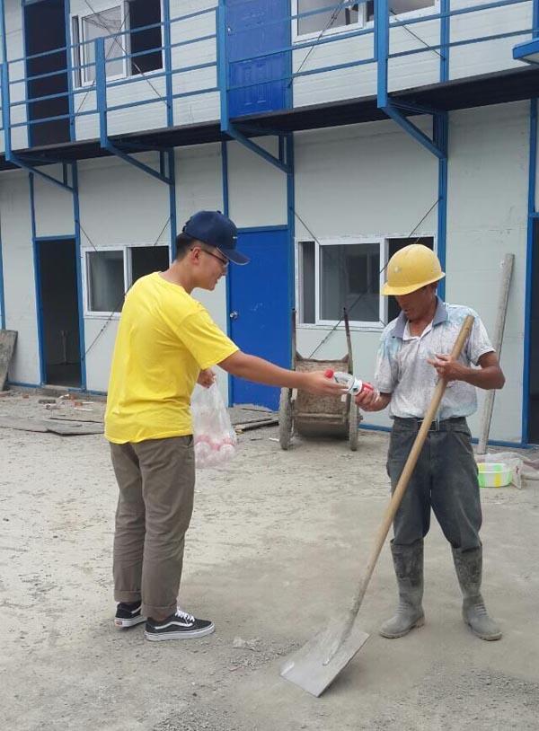 志愿者向建筑工人赠送饮用水