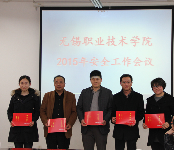 会议由保卫处副处长陶惠良主持。会上表彰了2014年度安全先进集体和先进个人。机械技术学院、控制技术学院、学生处、后勤总公司四个部门作为代表与谈向群副书记签署了《无锡职院2015年维稳与消防安全工作责任书》。雪浪派出所冀晓华警官通报了近期周边治安情况及注意事项。
