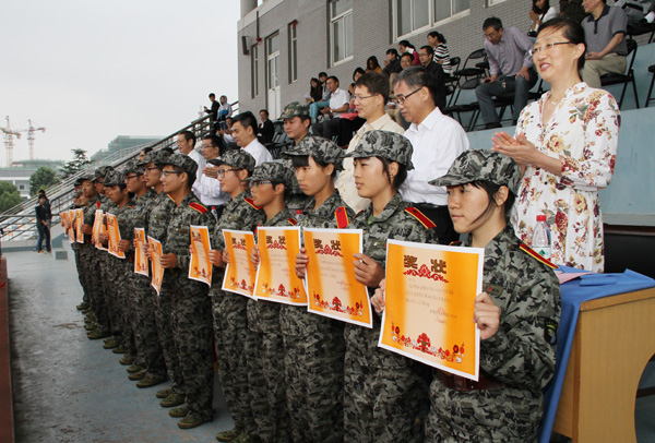 校党委副书记谈向群宣读了《关于表彰2014级学生军训先进单位和先进个人的决定》,16个连队和161名优秀学兵获表彰,校领导和部队首长向先进连队和个人颁发了奖状;校党委书记朱爱胜向承担我校军训任务的人民解放军部队赠送锦旗。副校长华坚对今年的军训工作进行了全面总结,代表学校向承担承训部队全体教官表示衷心的感谢和崇高的敬意,向圆满完成军训任务的全体新同学表示慰问和祝贺,并要求同学们将军训的收获和成果巩固下来,贯穿到今后的学习和生活中,努力把自己培养成全面发展的高素质人才。(魏艳 王卫东 高凤)