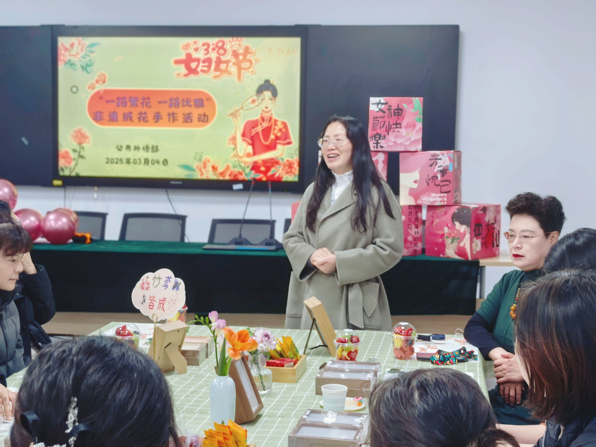 三月的春风,吹开了枝头的第一朵花,也唤醒了人们对美的无限向往。在第115个“三八”国际妇女节即将到来之际,公共外语部分工会于3月4日下午在国际交流中心308室为部门全体女教工精心策划了一场别开生面的“一路繁花,一路优雅”非遗绒花手作活动。校党委副书记杨雪琴参加活动,与老师们一同在这指尖绽放的繁花中,感受传统文化的深厚魅力,收获节日的无尽喜悦。