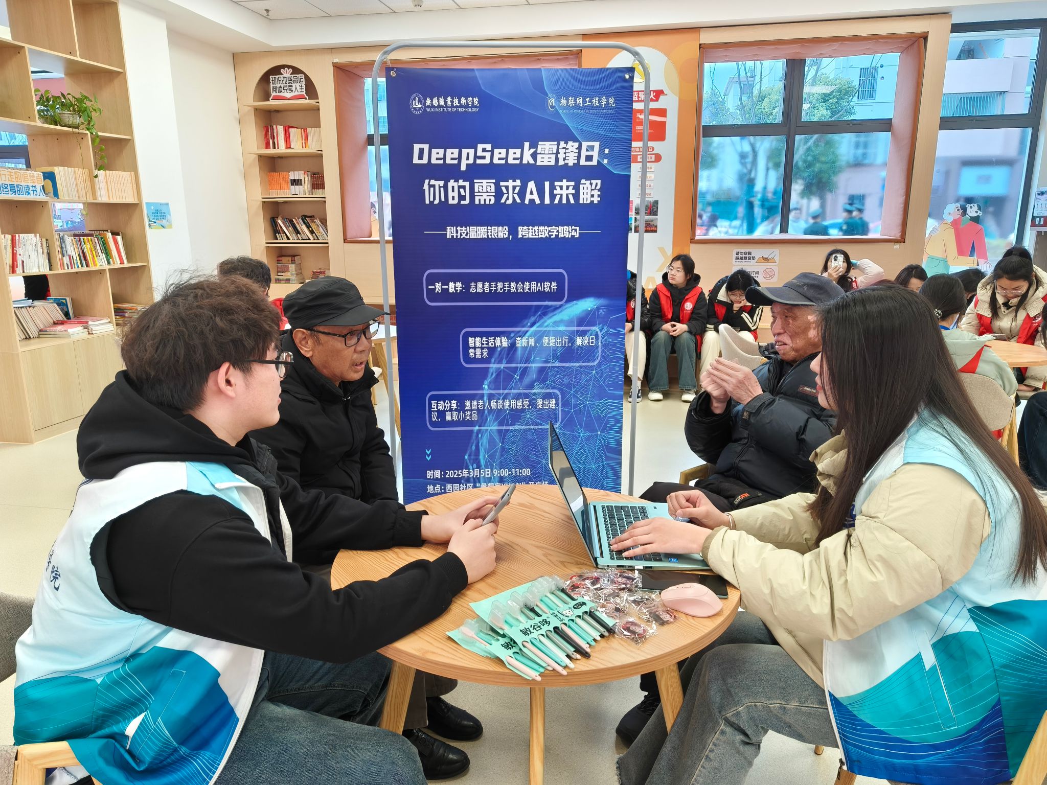 智慧暖阳融银龄,AI架桥越鸿沟。3月5日清晨,物联网工程学院10余名师生党员与团员干部,满怀热忱地走进西园社区,开展了一场别开生面的“DeepSeek雷锋日:你的需求AI来解”智慧助老活动。活动以AI科技为纽带,与社区近百位银龄居民共同开启了一场跨越数字鸿沟的春日之约。