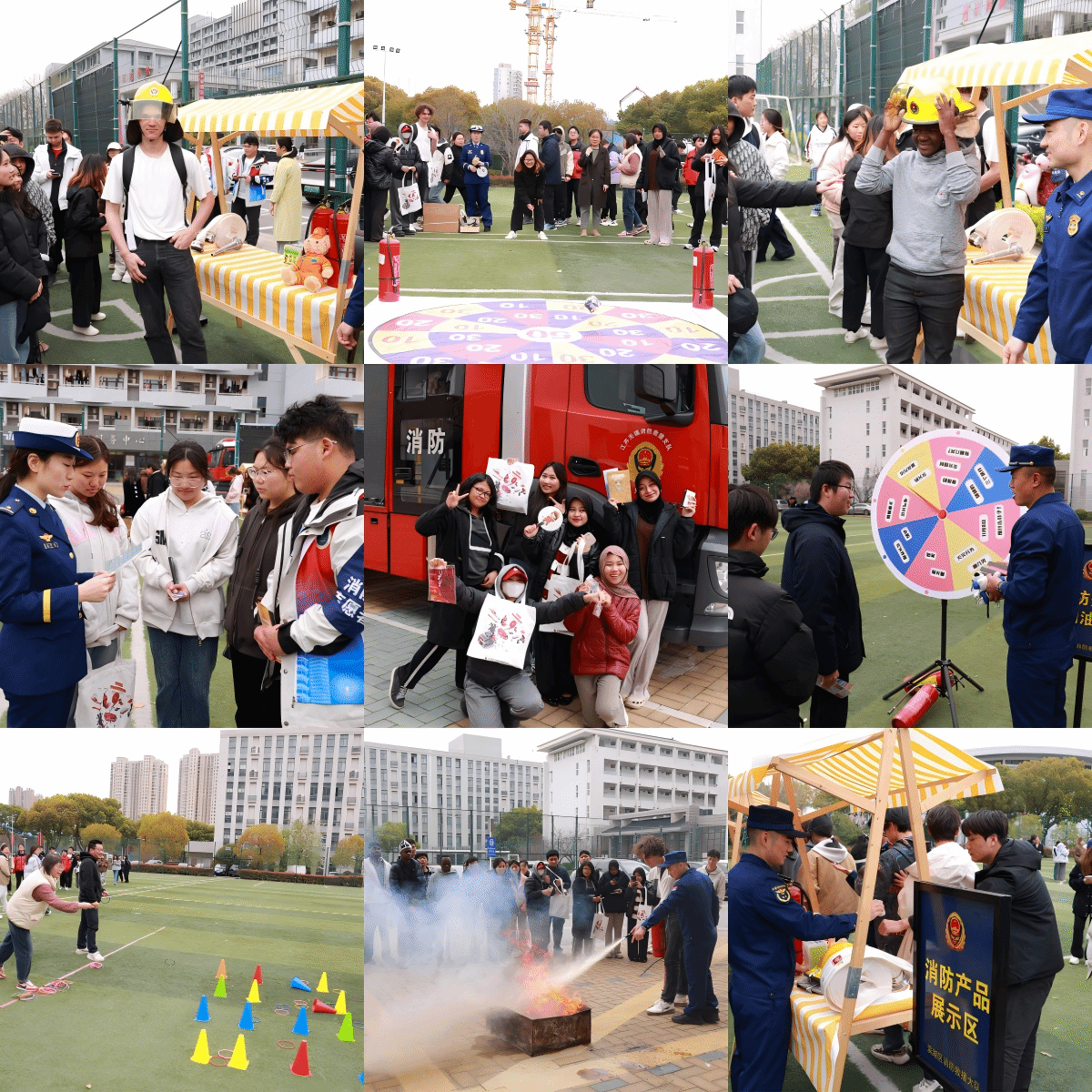 活动现场热闹非凡,师生积极参与,共同体验了智慧转盘问答、灭火套圈竞技和消防标识科普等丰富多样的互动环节。在实战演练区,俄罗斯学生用流利的中文高喊着“提、拔、握、压”的灭火器操作口诀,与队友们紧密配合,成功扑灭模拟火情,赢得了现场师生的阵阵掌声。