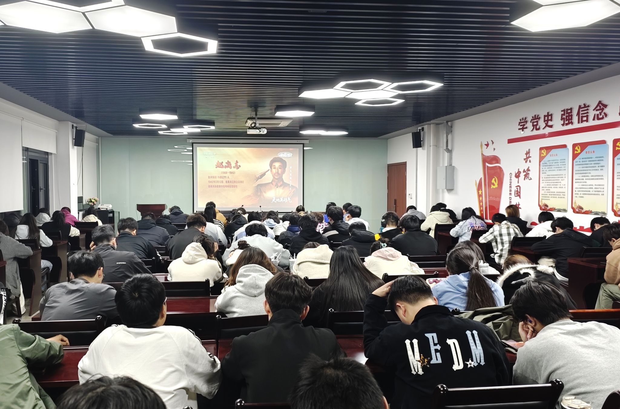 4月2日晚,敏行楼202会议室座无虚席,大家共同观看央视推出的2025年清明特别节目《天地英雄气》的首发节目《头颅可断志不磨》和《冰天雪地矢壮志》,影片深刻展现了东北地区爱国抗日将领杨靖宇和赵尚志的英雄事迹,观影过程中,不少同学眼眶泛红,被两位先烈誓死守卫国土的精神深深震撼。“英雄的热血洒满祖国大地,我们要珍惜韶华,砥砺奋斗,不负英雄气。”电气24013班团支书陶俊凯同学说。