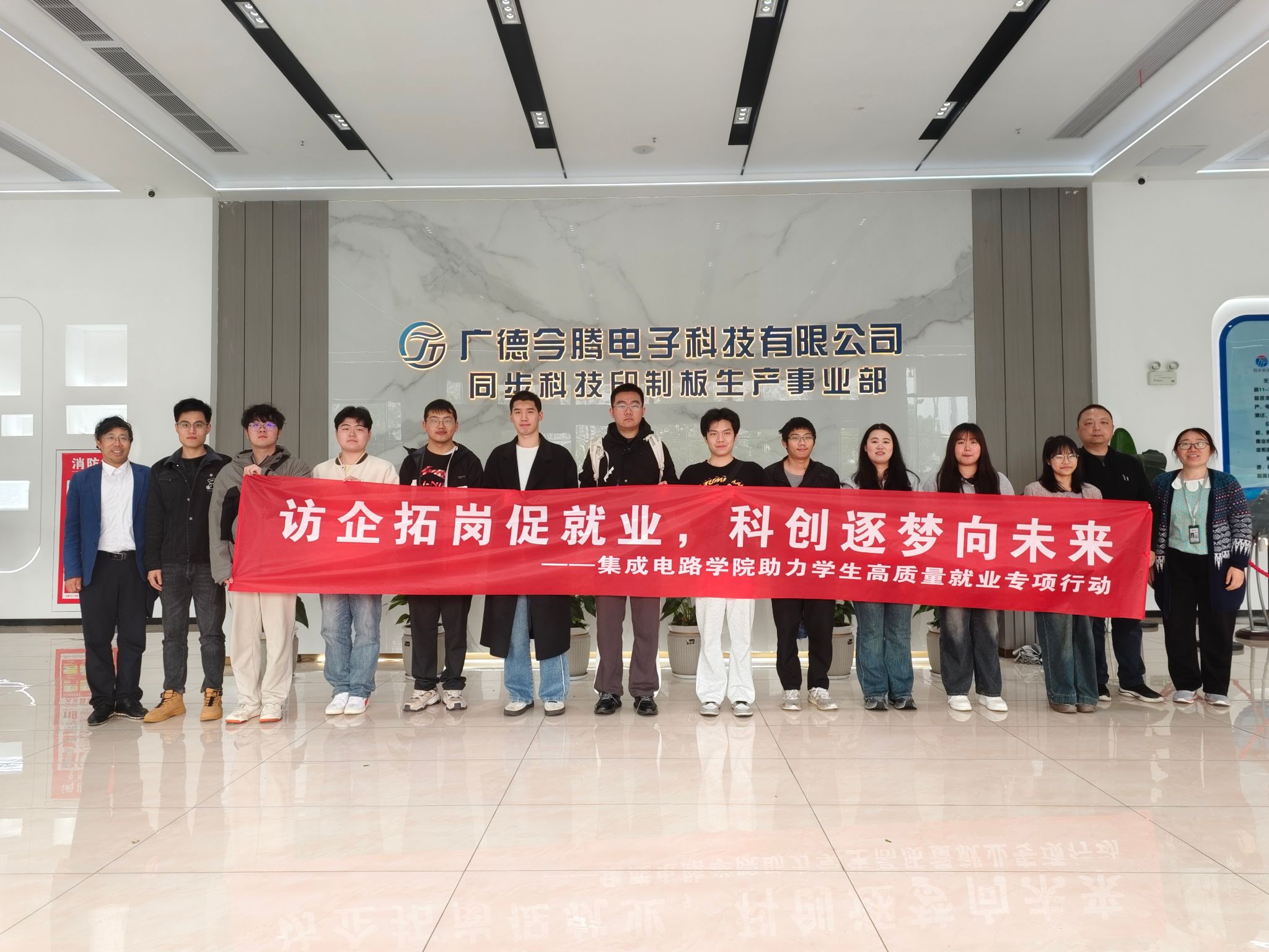 为贯彻落实教育部高校毕业生就业工作决策部署,进一步推进学校“访企拓岗促就业”专项行动,4月12日,集成电路学院组织师生赴安徽广德今腾电子科技有限公司开展调研走访活动,通过实地考察、合作交流和工艺研学,探索校企协同育人新模式。