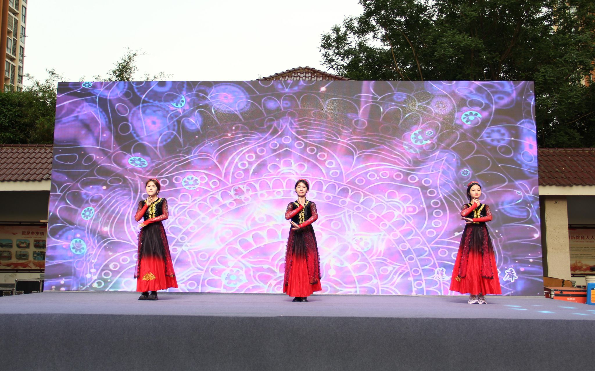 文艺汇演上,我校学生凯迪日耶·艾合买提、阿依姆古丽·阿不都克然木、穆妮热·艾斯卡尔以一支充满生机的民族舞蹈《春之畅想》开场,形成跨越地域的文化共鸣。演出过程中,社区广场四周逐渐围满了驻足观看的居民,72 岁的退休教师李先生忍不住拿出手机录制视频:“你看这动作里既有民族舞的韵味,又有端午赛龙舟的意象,孩子们把传统文化编得这么活灵活现!”当舞蹈进入高潮,三位舞者手拉手围成石榴花造型时,台下爆发出持续的掌声与喝彩声。“我们想通过舞蹈展现各民族文化的魅力,让更多人感受团结的力量。”阿依姆古丽说道。