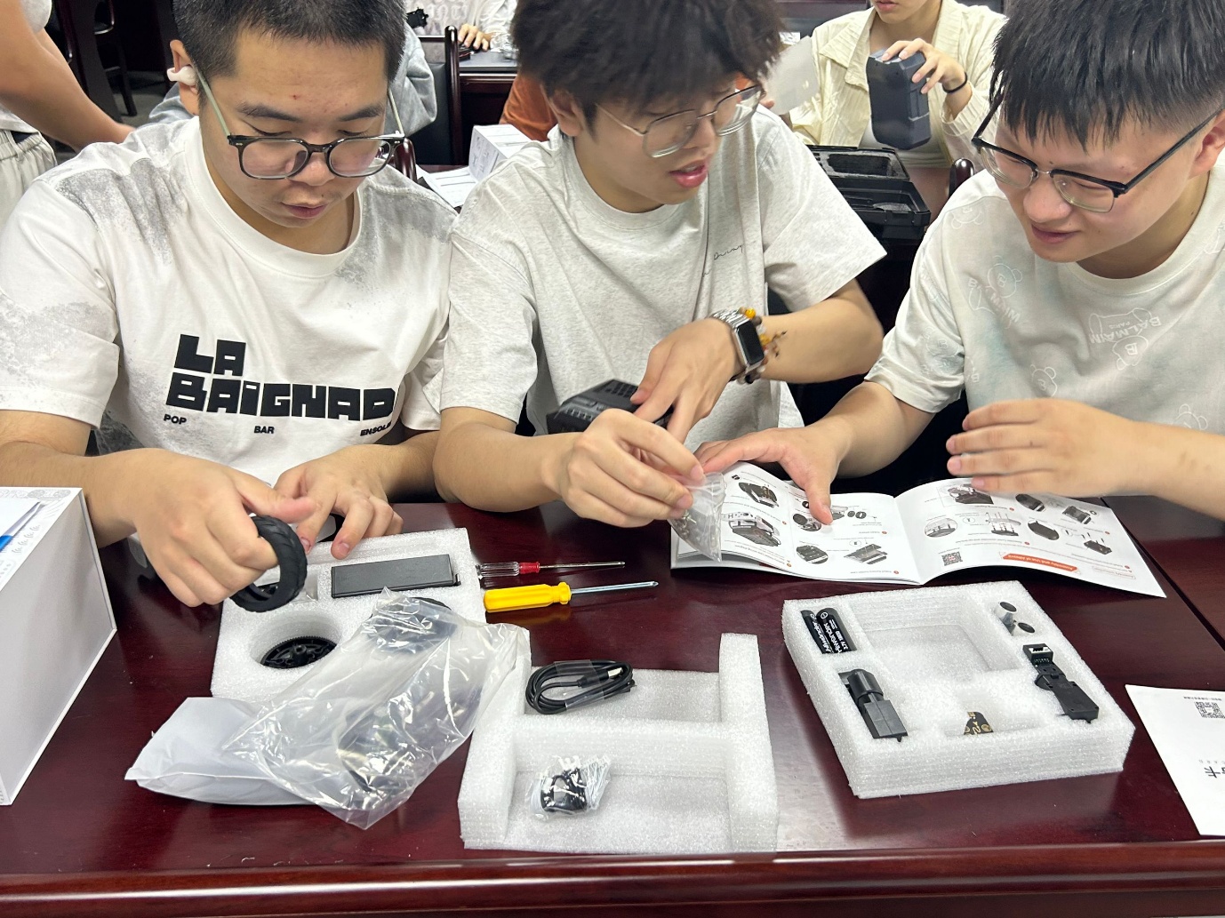最激动人心的机器人组装环节中,现场划分成多个小组赛区,小型无人机、变形金刚机器人、小型机器狗、循线编程机器人等套件摆放整齐,等待着同学们赋予它们“生命”。在小型无人机组装区,同学们紧皱眉头,面对错综复杂的线路和零件,他们先将零件按功能分类,再对照图纸反复确认组装顺序。“这个螺旋桨的转向装反了,会导致无人机起飞失衡!”经过多次尝试和调整,当无人机在他们手中缓缓升空,平稳盘旋时,大家激动地击掌欢呼。在变形金刚机器人组装区,同学们发挥创意,在完成基本组装后,还用丙烯颜料为机器人绘制了独特的图案,让冰冷的机械零件瞬间充满个性。小型机器狗组装区则充满了欢声笑语,当一只机器狗摇摇晃晃“站”起来,模拟小狗走路的憨态时,围观同学纷纷拍照,直呼“太可爱了”。循线编程机器人区域,同学们围在跑道旁,紧张地注视着自己的作品,看着机器人沿着黑色线条精准移动,成功抵达终点,大家忍不住鼓掌庆祝。