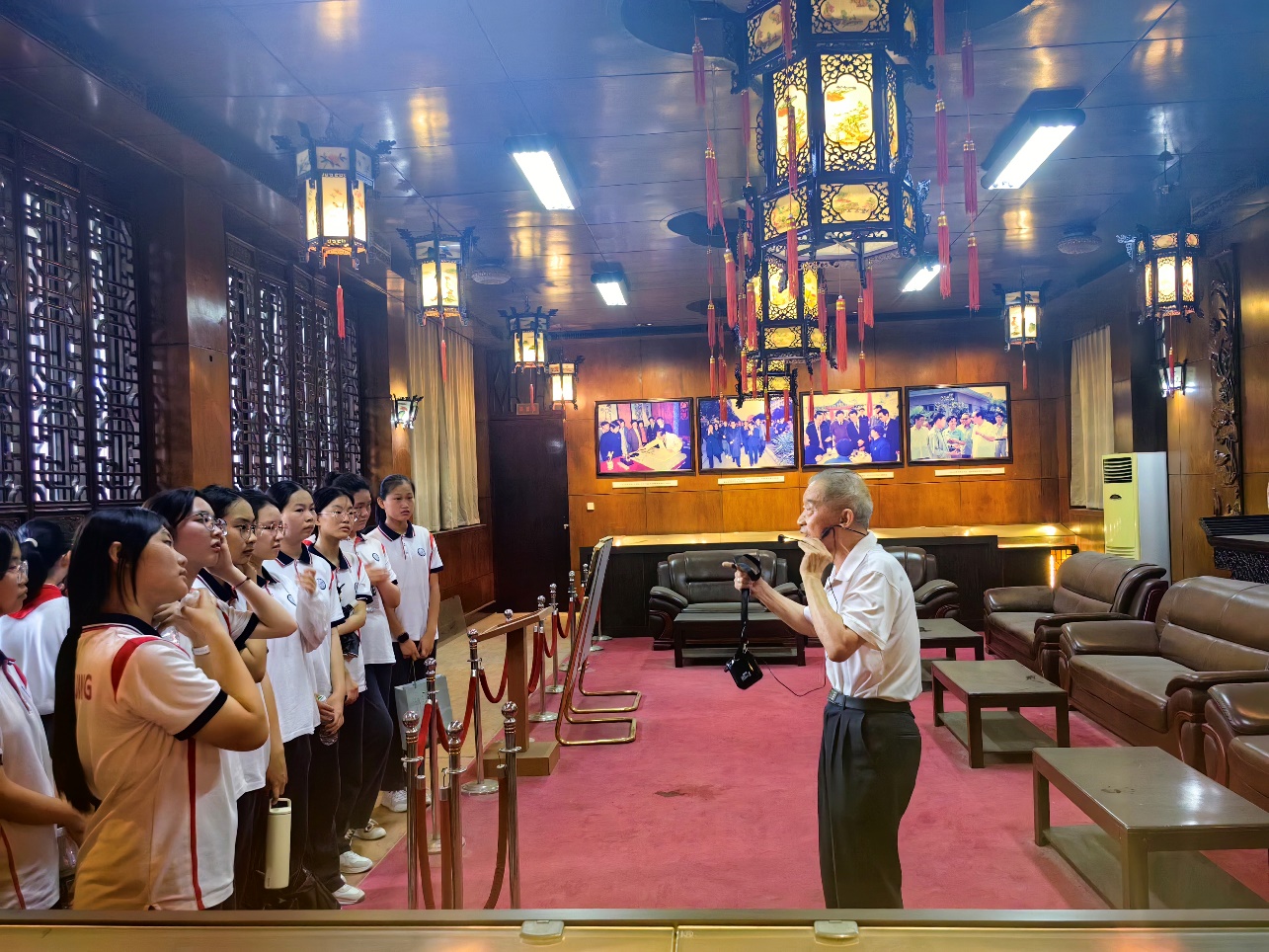 华庄文化宫是一座位于无锡经济开发区的地标性建筑,建于1986年,是江苏省第一个农民文化宫,它承载着老一辈华庄人的记忆与情感,见证了华庄的蓬勃发展。本次研学活动邀请到华庄街道文化站原站长许竞鹤老先生为同学们讲述华庄的红色历史文化。走入馆内,他指着一件件充满历史的展品向同学们讲述了历史上多位中央领导到访参观的故事。讲到激昂处,他动情地向在场中小学生及大学生党员说:“新中国成立以来,华庄孕育了一代又一代奋发有为的学子,他们为国家的富强、民族的振兴挥洒汗水,他们以百折不挠、坚毅勇敢的开拓精神,以骄人的成就为华庄增光添彩,为后来者树起一座座丰碑。”大家认真听着许老重温那一段段峥嵘岁月,回顾华庄前辈一路走过的艰辛历程,纷纷表示要更加珍惜今日来之不易的幸福生活。