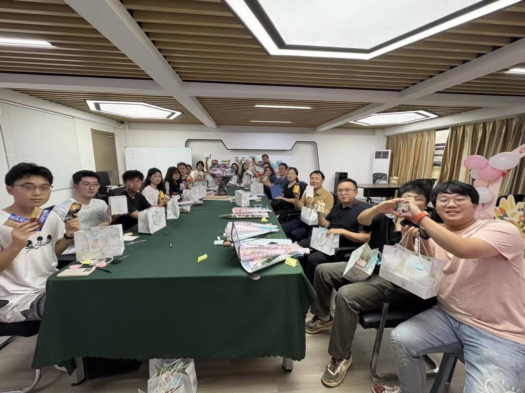 花艺创作环节,师生化身“花艺师”,指尖翻飞间修剪枝叶、搭配花束。同学们将手作花束递予老师,以花语传感恩;老师们也亲手包花,犒劳教学辛劳。盲盒互赠环节让氛围升温,同学抽教师盲盒,收获知识与鼓励;教师拆学生盲盒,感受青春创意与祝福。合影则定格下“师生同心、共促成长”的美好瞬间。