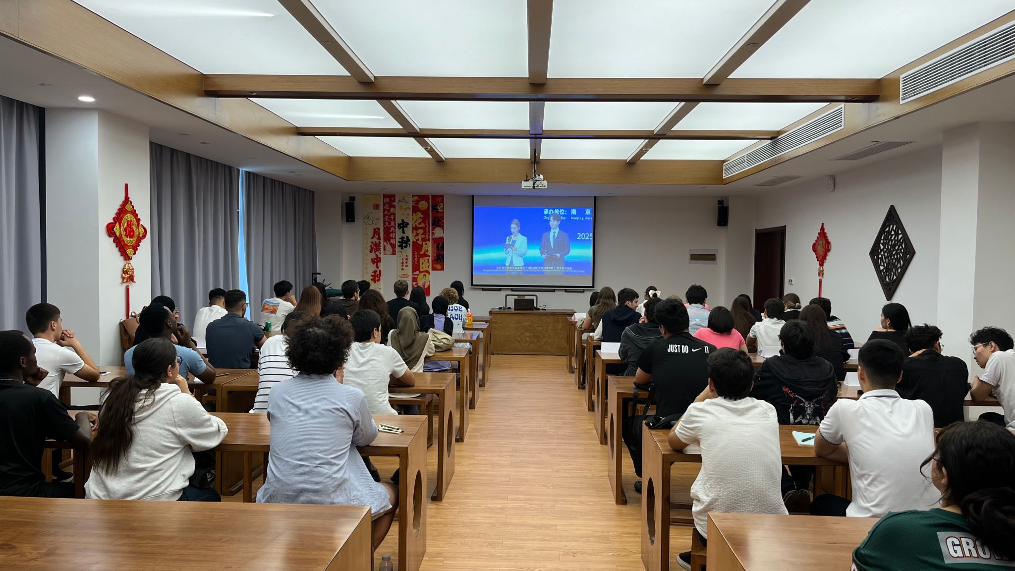 10月13日,国际教育学院在校园孔子课堂组织来华留学生“开学第一课”活动,来自摩洛哥、坦桑尼亚、哈萨克斯坦、俄罗斯、孟加拉国、尼泊尔、巴基斯坦等7个国家的140余名新生集中观看“江苏高校来华留学生开学第一课”活动视频,更好地了解江苏、适应在华学习生活。