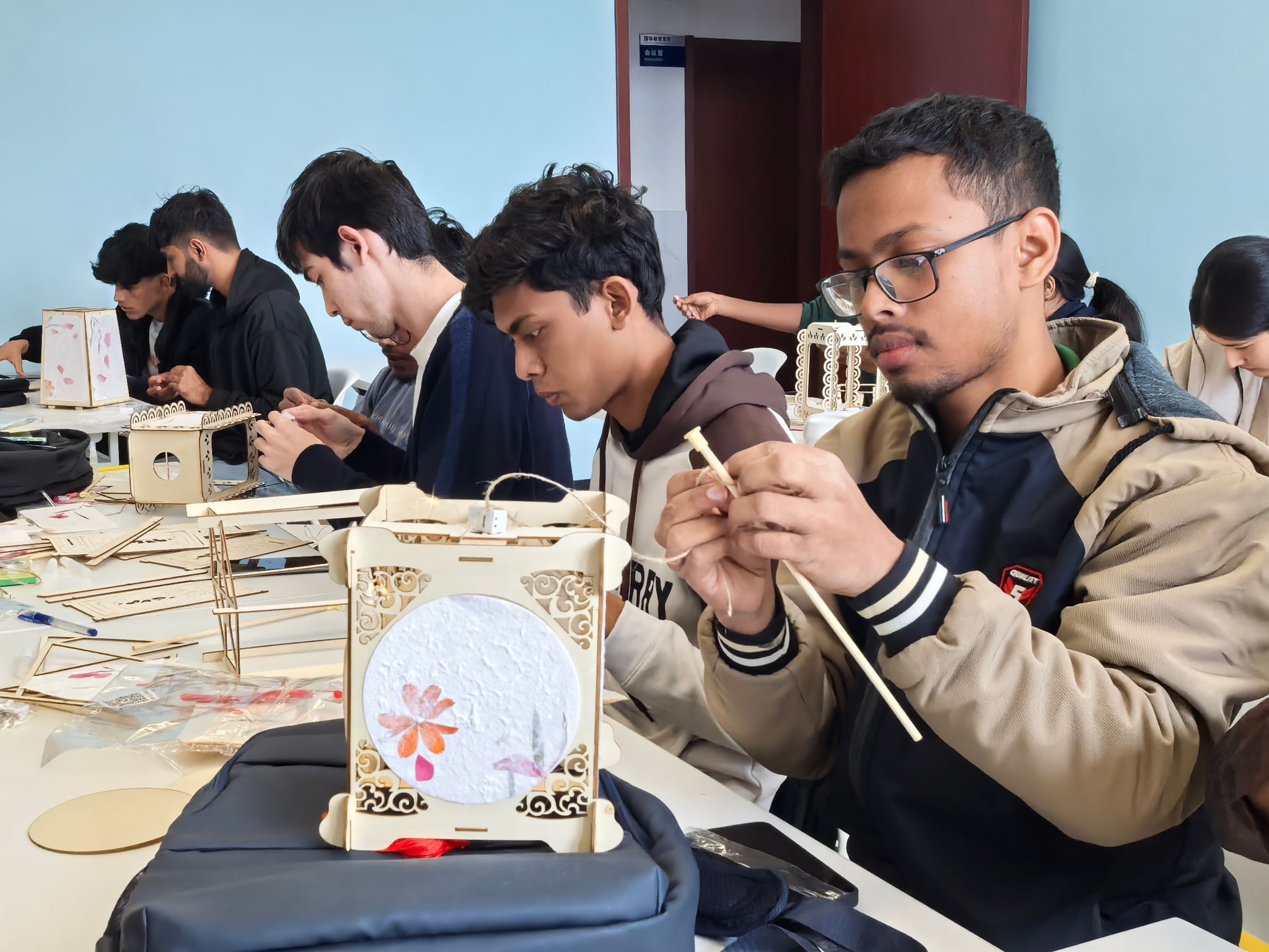 活动在轻柔的中国传统音乐中拉开帷幕。破冰环节的“光影接龙”迅速拉近了彼此距离。在了解灯笼承载的“团圆与希望”文化寓意后,同学们在老师的引导下进入专注的创作阶段。裁剪宣纸、描绘图案、组装灯架,指尖的细致操作成为凝聚注意力的“正念练习”。随着一盏盏独具特色的灯笼渐次成型,活动迎来了最动人的“点亮仪式”——室内灯光暗下,四十盏手工灯笼同时亮起,温暖的光芒瞬间照亮了整个空间,也映照出同学们惊喜与感动的脸庞。在随后的分享中,巴基斯坦学生艾哈迈德动情地说:“这盏灯让我想起了家乡的节日,虽然远离家人,但在这里我感受到了同样的温暖。”杨意健同学则表示:“教国际同学做灯笼的过程,让我对传统文化有了新的理解。”