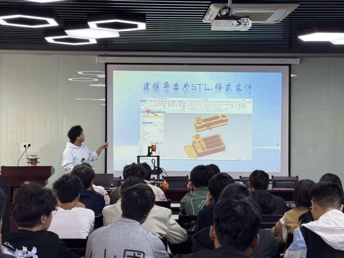 宋誉林以3D打印在生活和军事模型的实践应用为主题,带来了一场生动的技能培训课。他系统讲解了3D打印的技术原理与材料选择,并结合自身经验进行了深入浅出的剖析。他通过现场演示零件建模与打印全过程,生动呈现了从数字模型到实体成果的完整创作链路。刘苏龙围绕大学发展与规划展开经验分享。他结合自己的求学与职业发展历程,从专业知识积累、社团实践锻炼到职业规划制定,为学弟学妹们提供了宝贵的建议。